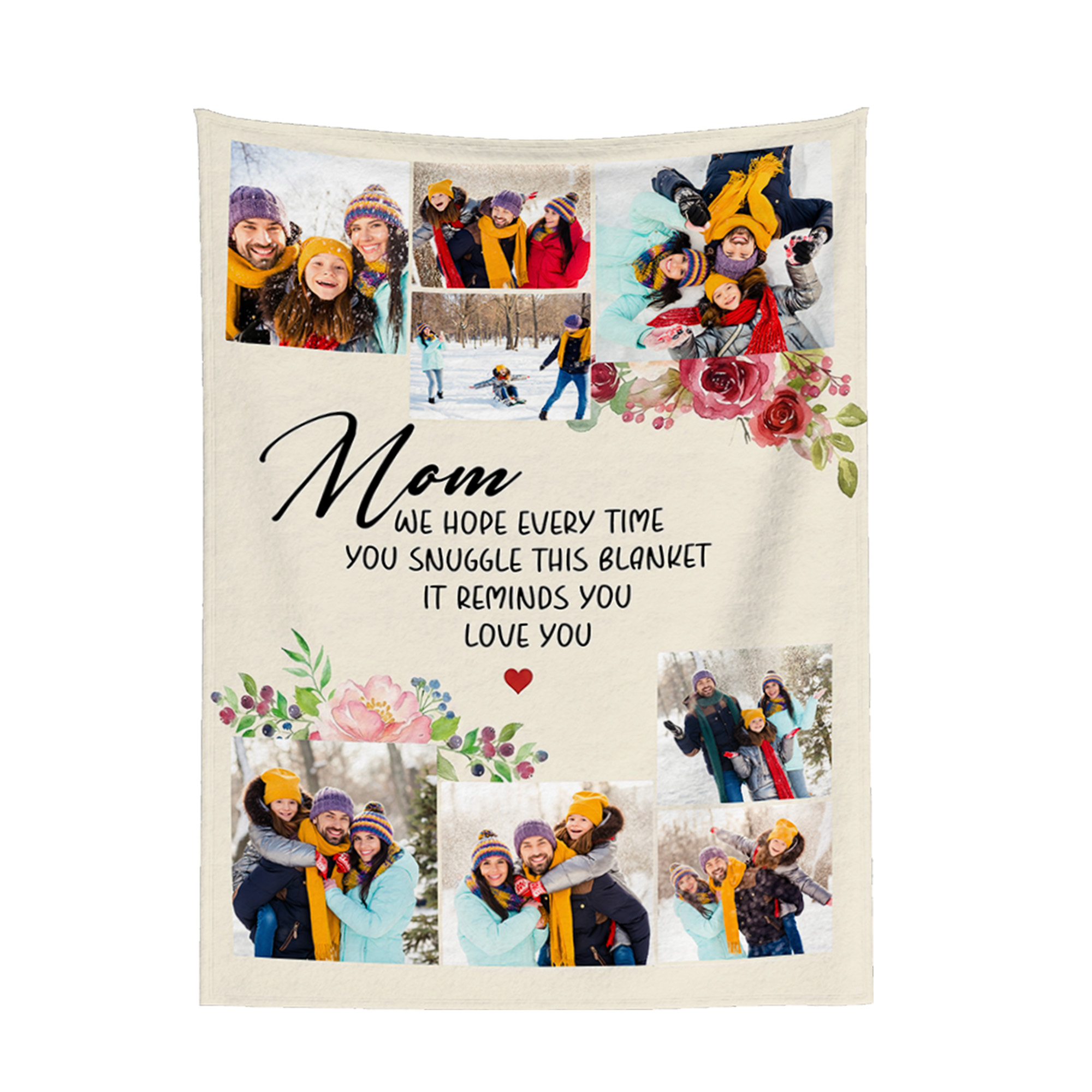 Floral Photo Collage Design - This blanket features a soft floral theme combined with a photo collage layout, creating a warm and heartfelt look. The balanced design blends flowers and memories with mom/grandma, adding a cozy and meaningful touch to any room.