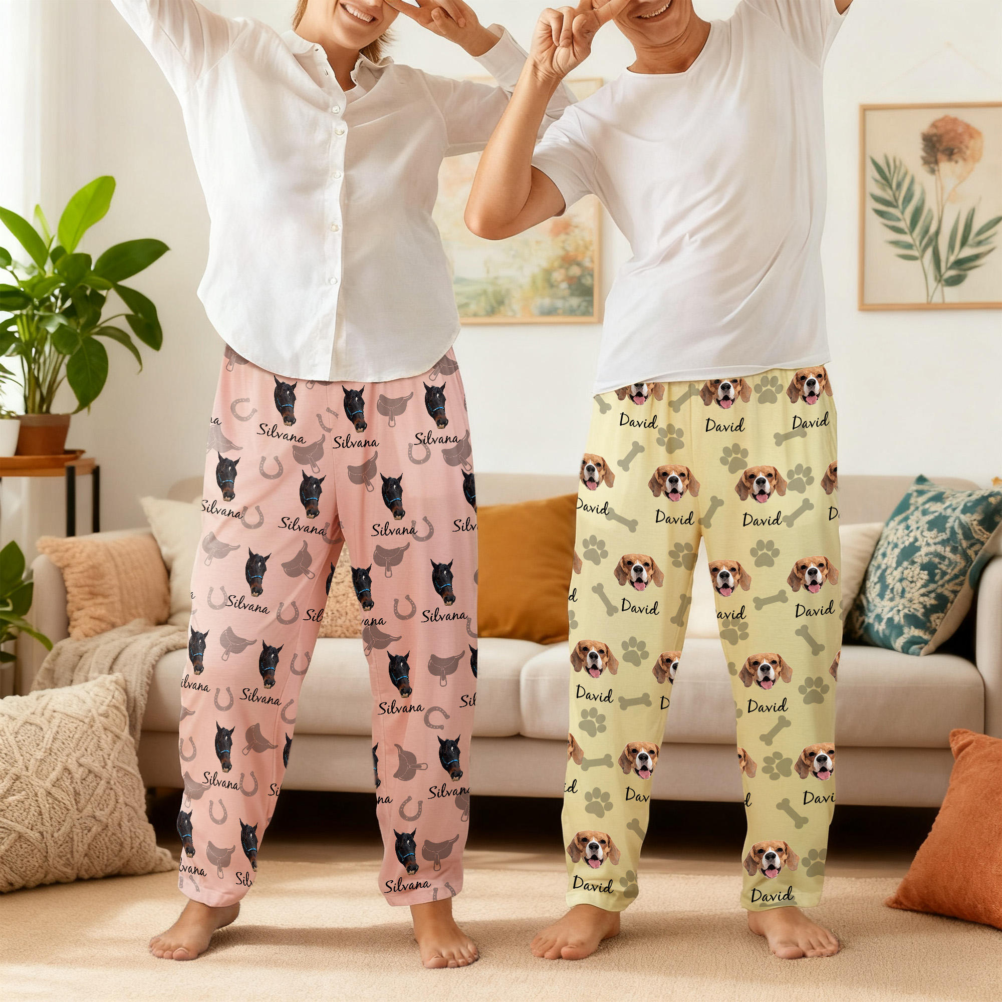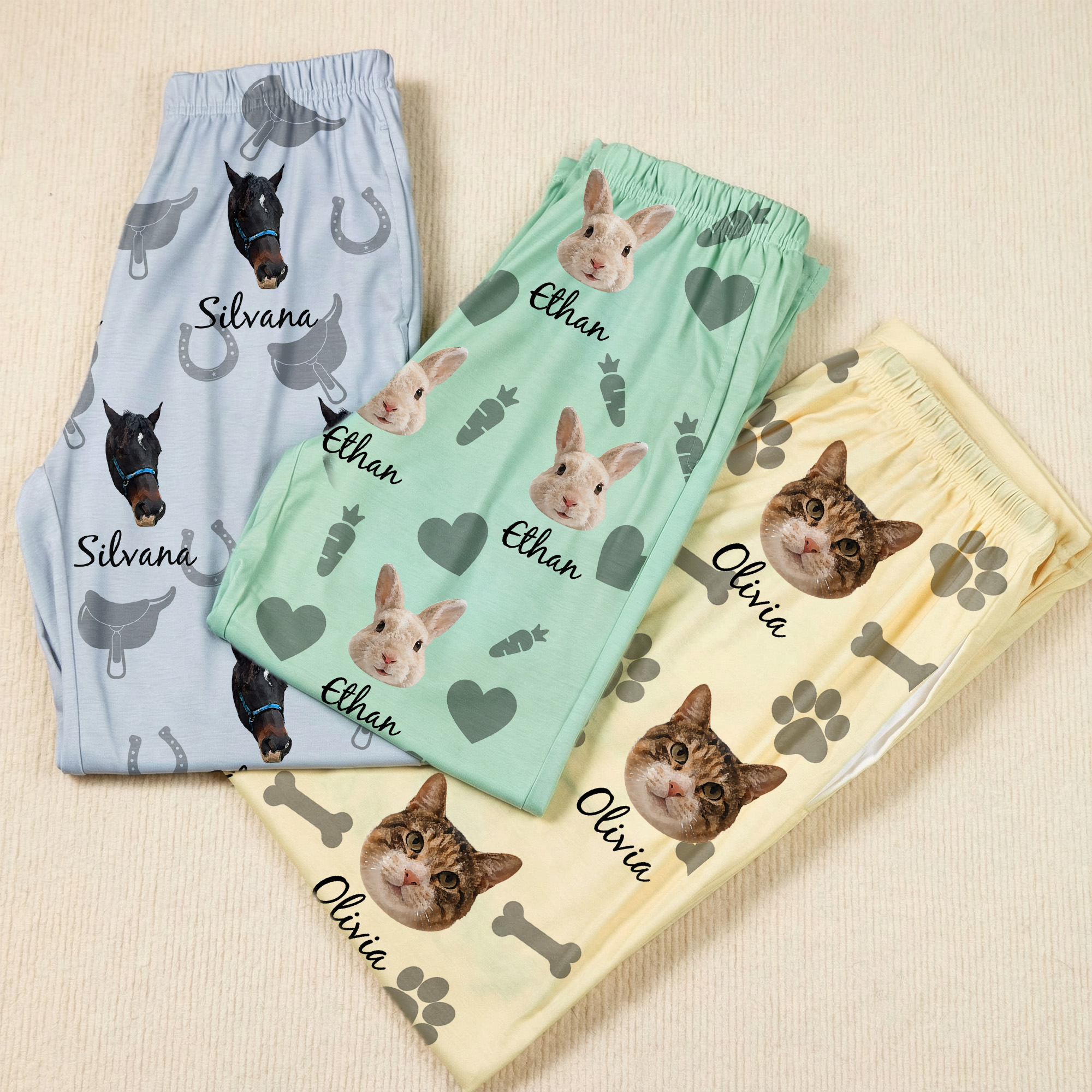 Cute Design - This playful layout combines heart icons with carrots, horseshoes with saddles, or paw prints with bones to celebrate the bond between you and your animal. The pet portraits and names sit surrounded by those cute icons, giving the pants a warm, personal look with a fun and slightly quirky vibe.